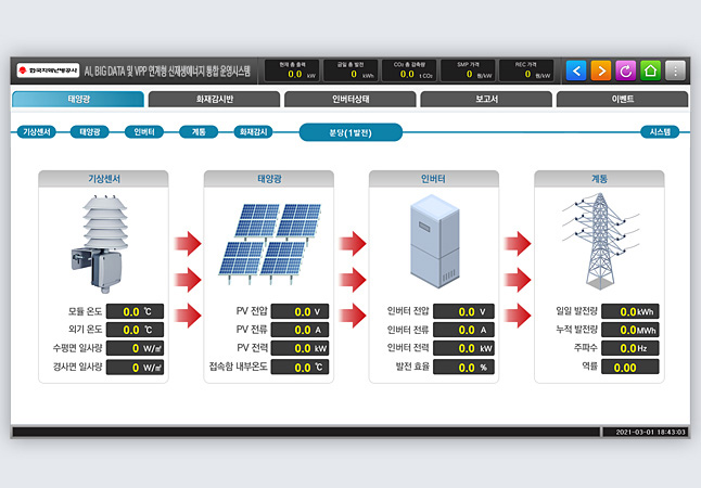 신재생 에너지 자원(태양광, 풍력 등) 각종설비 데이터(인버터, 기상, 고압/저압반, 화재감시 등) 정보를 1분단위로 계측하여 인공지능 및 빅데이터와 연동하여 예측가능한 에너지 자원으로 활용하는것을 목표로 합니다.